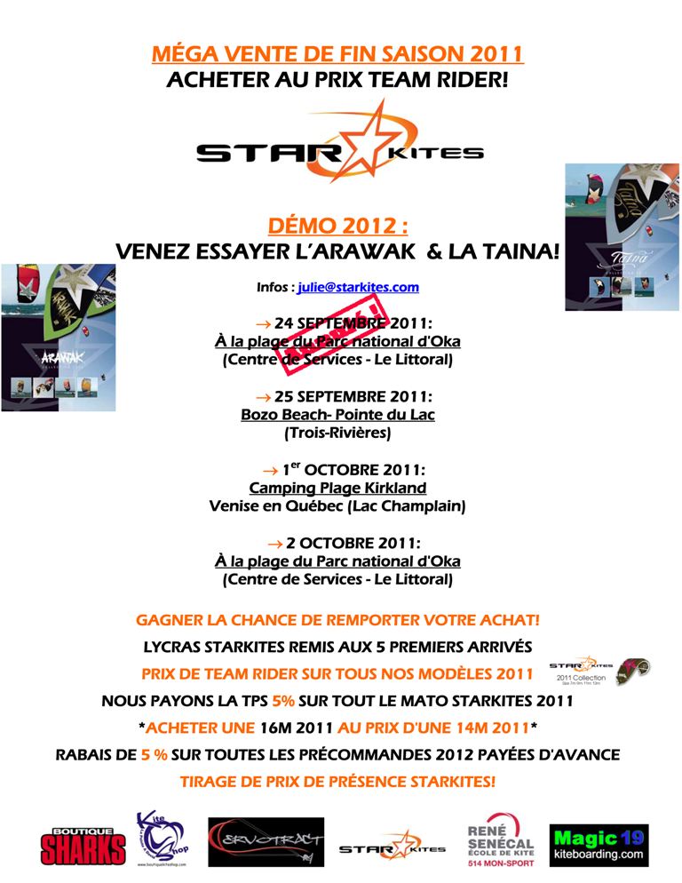En raison du manque total de vent, la première journée démo STARKITES 2012 et Méga Vente fin de saison 2011 STARKITES, qui devait avoir lieu samedi 24 septembre 2011 à la plage du Parc national d'OKA, est ANNULÉE et reportée officiellement le 2 octobre 2011.